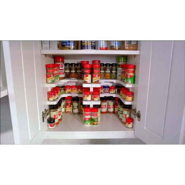 With over a million already sold, satisfied customers everywhere are using their Spicy Shelve to organize EVERYTHING in their cabinets! Spices, pill & supplement bottles, fingernail polish, crafts and more! One set of 4 shelves. Stackable, or side by side. 4 different size legs for short or tall spice bottles. Organize up to 64 spices and see them all at a glance! It can turn a mess of spices into an organized masterpiece!
